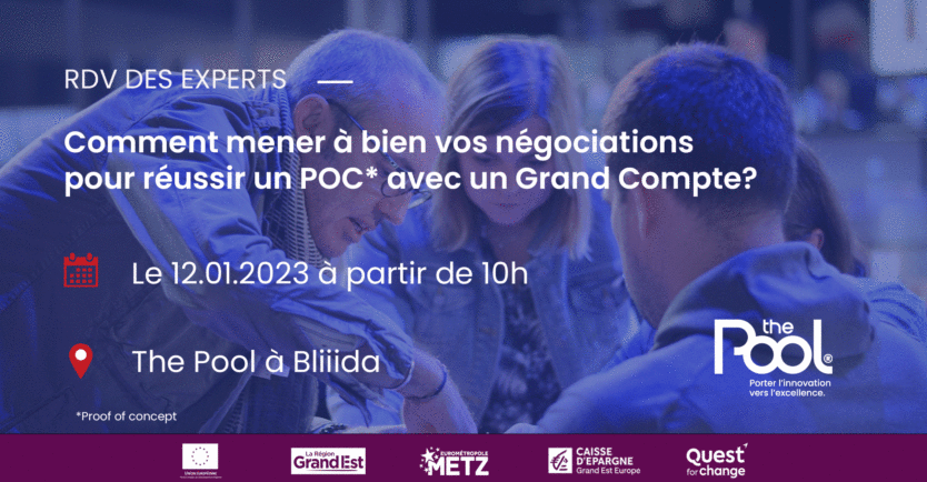 Vous rencontrez des difficultés à transformer vos négociations en POC réussi ? Vous souhaitez savoir comment convaincre des grands comptes de vous faire confiance ? Venez rencontrer et échanger avec Eric Elabd, Avocat associé - Executive Director du cabinet EY Ventury, spécialisé dans le développement des startups et entreprises innovantes, lors d’une matinée conviviale le 08/12 à partir de 10h à l’incubateur The POOL.
